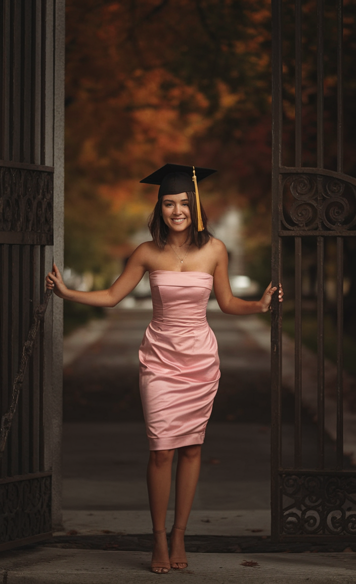 A soft and feminine graduation look idea 2025, this strapless pink satin dress combines elegance with a modern touch. The fitted bodice and ruched details enhance the silhouette, while the knee-length cut keeps it refined. Styled with nude heels and a graduation cap, this outfit is ideal for a charming photo shoot or an elegant party.