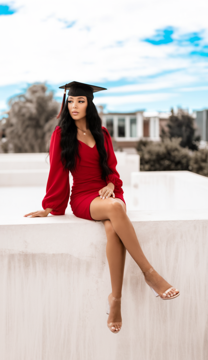 This bold red dress with long, voluminous sleeves is a striking choice for a graduation look idea 2025. The fitted silhouette and ruched details add a touch of elegance, while the deep V-neckline enhances the modern appeal. Paired with nude heels, this outfit is perfect for a photoshoot or an eye-catching story Instagram moment.