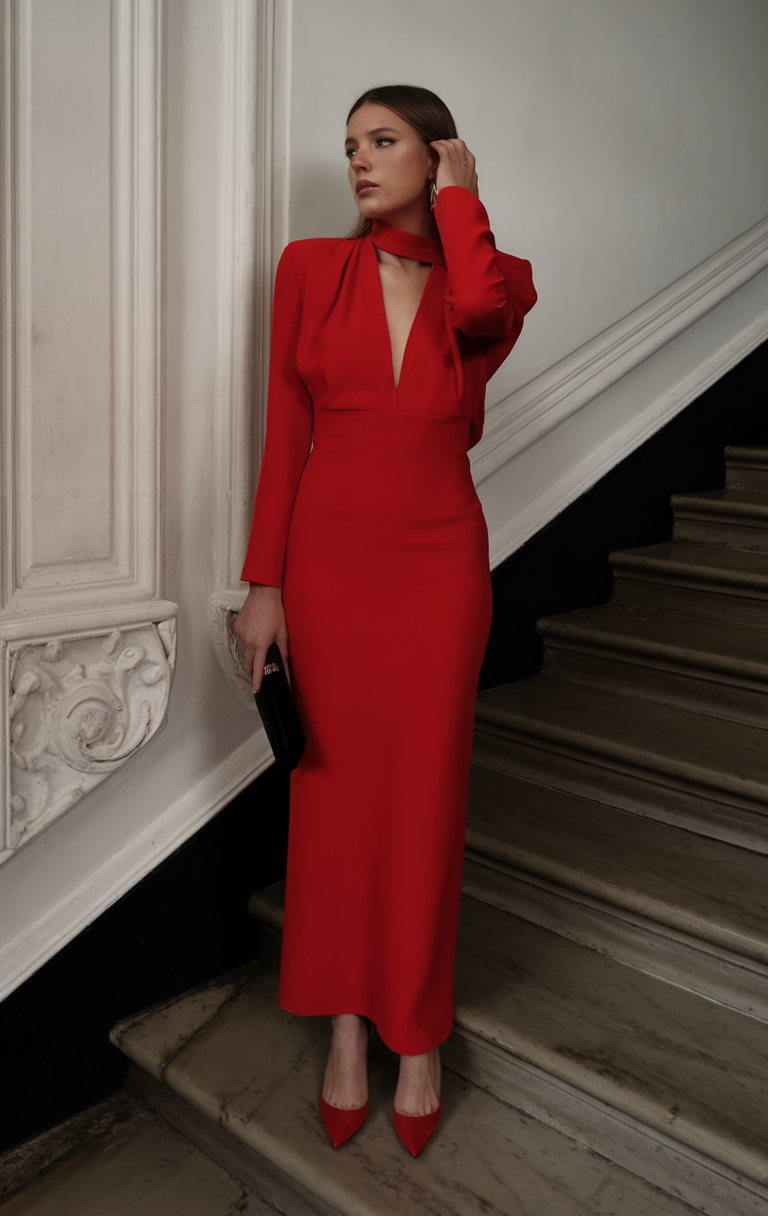 A timeless yet contemporary graduation look idea 2025, this red maxi dress features a structured silhouette with a fitted waist and subtle cutout at the neckline. The long sleeves and floor-length design exude sophistication, complemented by red pointed-toe heels and a sleek black clutch. This outfit is ideal for a dramatic studio photoshoot or a refined poster moment.