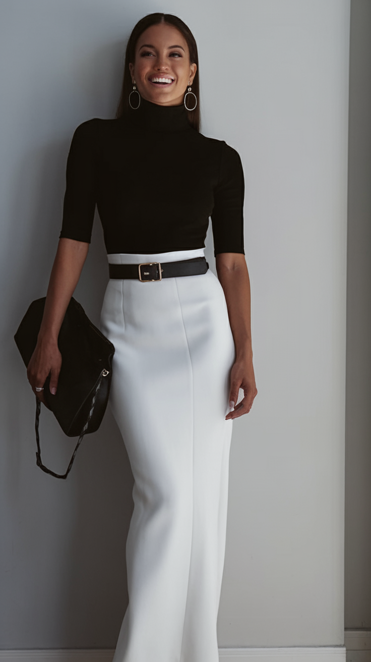 This simple yet refined outfit features a black fitted turtleneck paired with a high-waisted white skirt, creating a polished graduation look idea 2025. The structured waistband, accentuated with a sleek black belt, defines the silhouette, while a black handbag adds a timeless touch. Ideal for a photo shoot or an elegant poster, this look embodies modern minimalism.