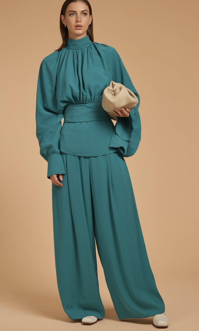 A bold yet natural ensemble, this teal set features a high-neck gathered blouse with billowy sleeves and a cinched waist for a structured fit. The wide-leg trousers complement the fluid design, while white square-toe heels and a soft beige clutch add a sophisticated contrast. Perfect for a studio photoshoot or a contemporary college photo shoot, this outfit blends style and comfort effortlessly.
