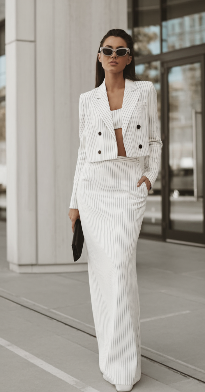 A modern take on classic tailoring, this striped two-piece outfit is a bold choice. The cropped double-breasted blazer pairs effortlessly with a matching high-waisted maxi skirt, both featuring sleek vertical stripes. The bandeau-style top adds a contemporary element, making the ensemble ideal for a statement photo shoot. The look is finished with dark sunglasses and a structured clutch, elevating the polished aesthetic.