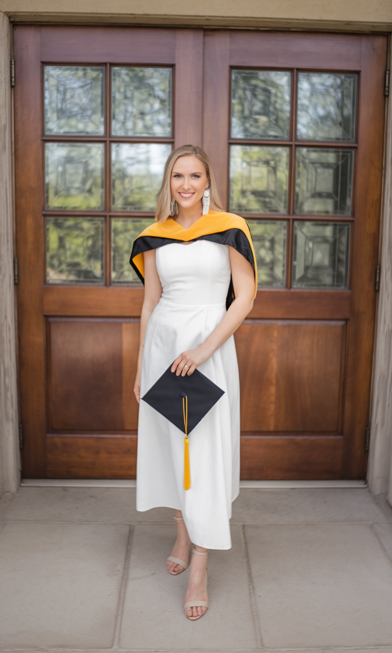 A refined and graceful graduation look idea 2025, this ensemble features a crisp white dress complemented by a gold and black academic hood. The modern silhouette makes it ideal for both a shoot and a celebratory poster. With elegant earrings and subtle nails, this outfit is perfect for a polished pic or a stylish caption for social media.