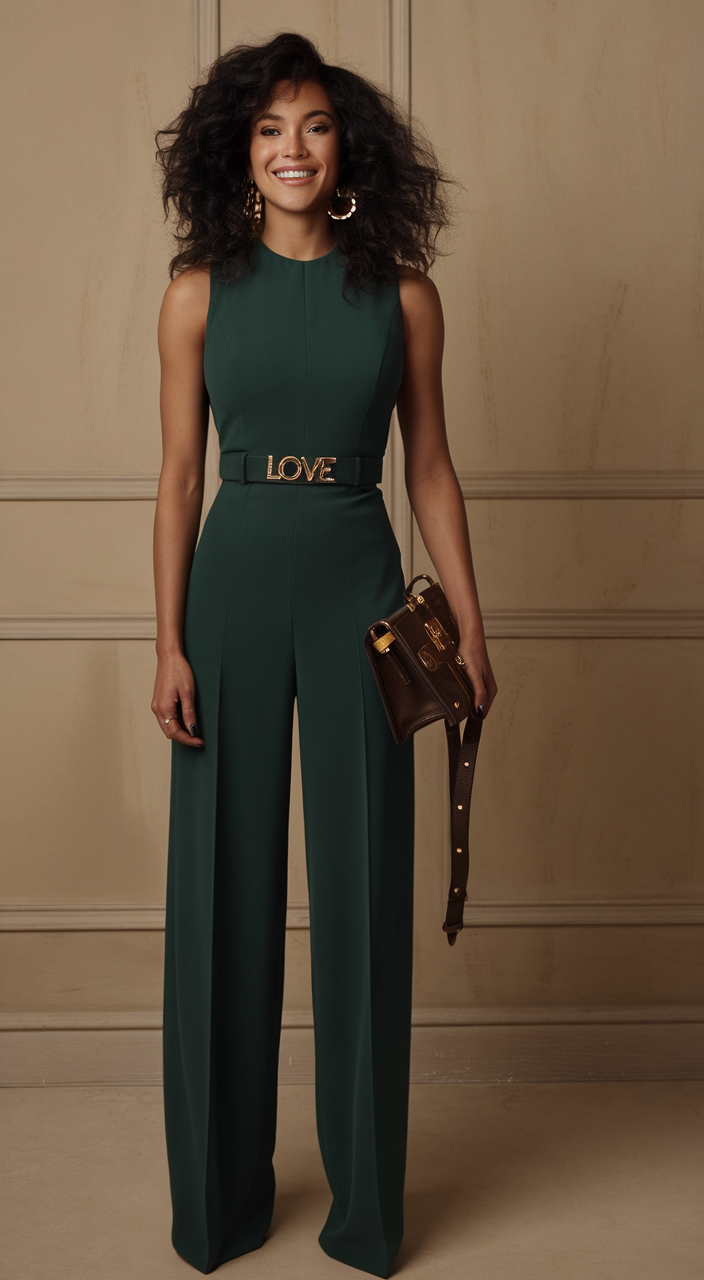 This elegant deep-green jumpsuit offers a modern alternative to the traditional gown, blending sophistication with a touch of glamour. The cinched waist with a gold buckle adds definition, while wide-leg pants create a flattering silhouette for a standout photo shoot. Gold accessories and a structured handbag complete the polished college celebration look.