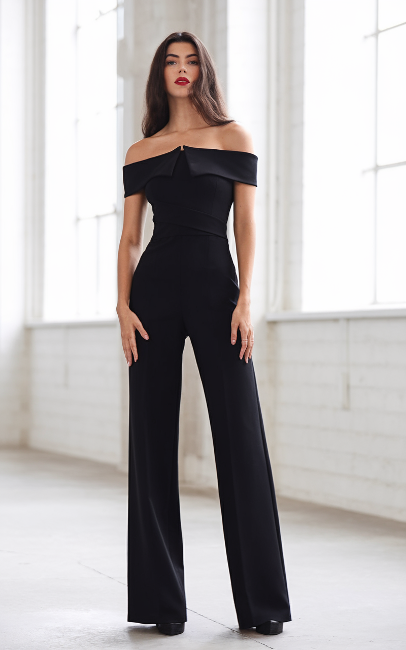This off-the-shoulder black jumpsuit is a sleek and sophisticated choice for a photoshoot or University graduation event. The fitted bodice enhances the silhouette, while the wide-leg pants add a touch of modern elegance. The structured neckline brings a refined edge, making it an ideal outfit for a poster or a bold story Instagram feature.