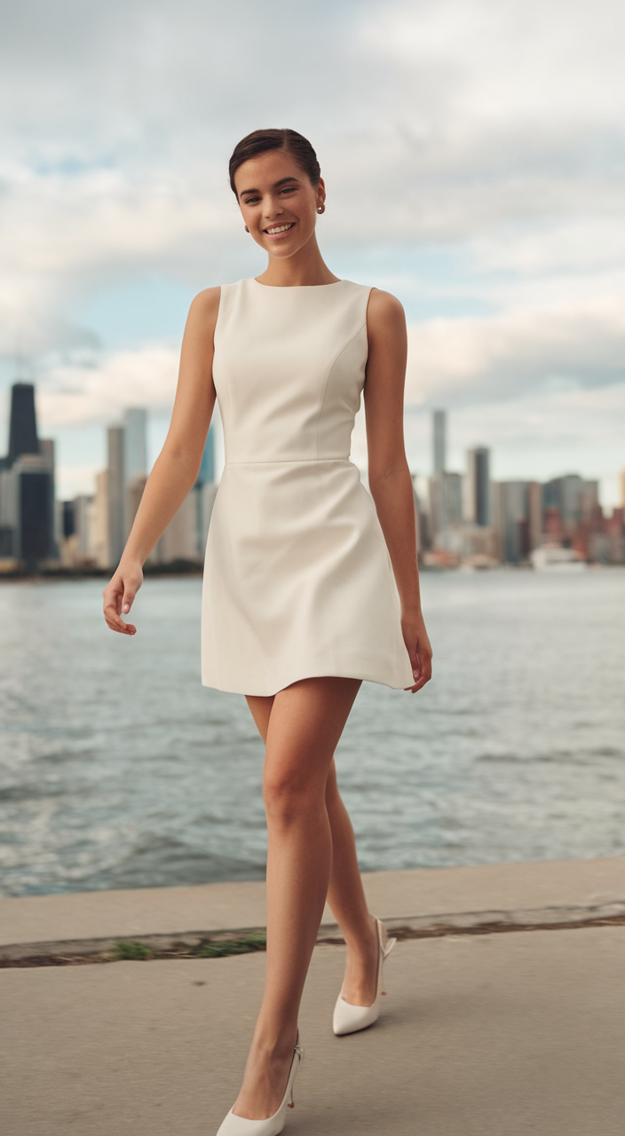 A clean and simple choice, this white sleeveless dress is perfect for an effortless graduation look idea 2025. The structured fit and above-the-knee length give it a fresh, youthful feel, while classic white heels complete the polished aesthetic. Ideal for a cityscape photo shoot or a celebratory party, this look is timeless and elegant.
