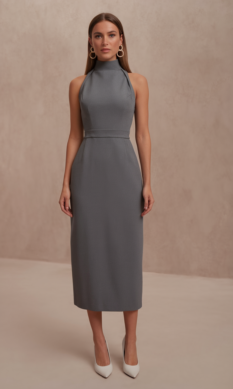 This high-neck, sleeveless gray dress exudes understated sophistication, making it a refined option for a studio photoshoot or a group photo. The fitted waistline enhances the silhouette, while the midi length keeps it natural and graceful. Paired with white pointed-toe heels and gold statement earrings, this look is perfect for capturing a stunning pic or caption for social media.
