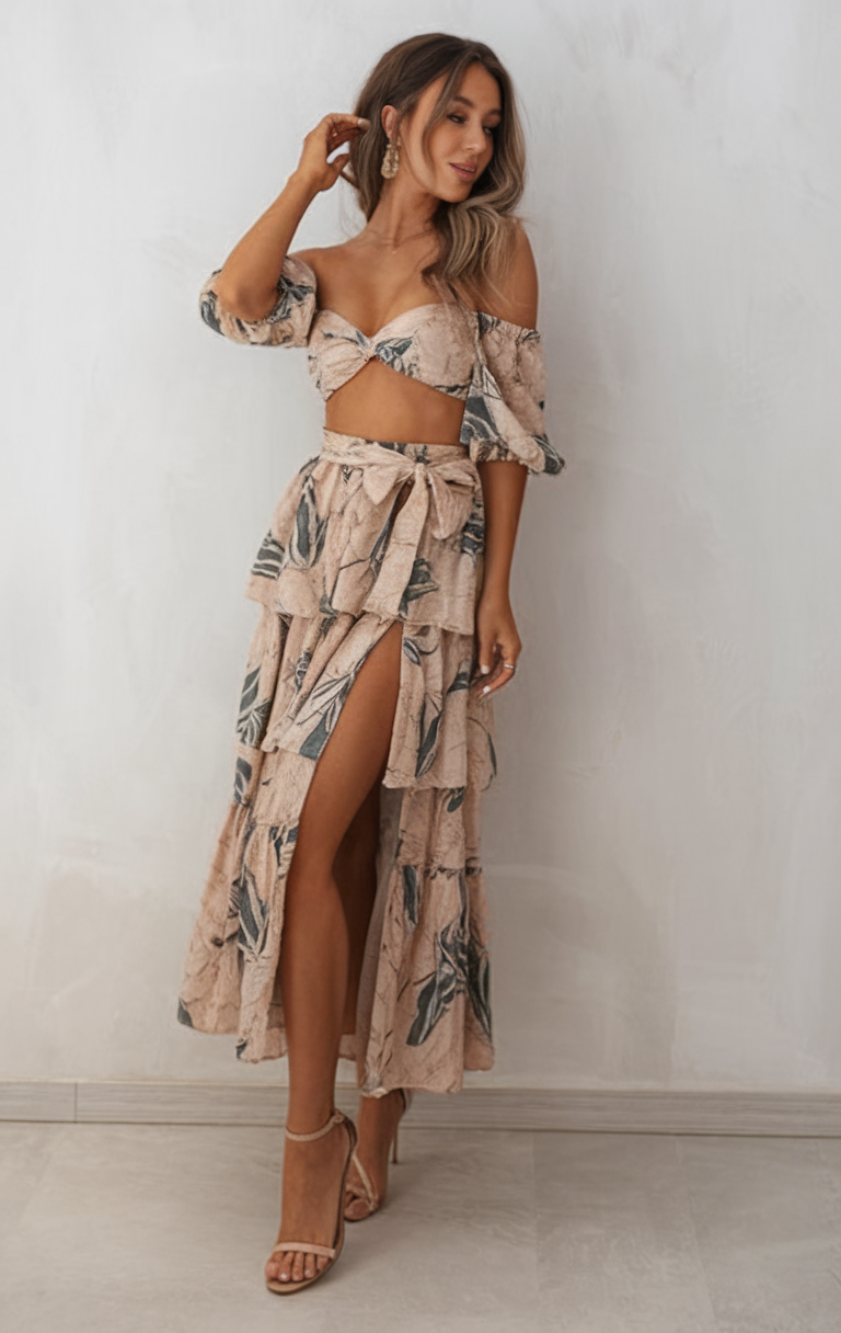 This boho-chic two piece set has an off the shoulder crop top and a tiered ruffle maxi skirt featuring a high slit. This soft beige fabric with botanical prints offers breezy, featherlight feel synonymous with Ibiza made summer outfits. Together with the delicate strappy heels, the whole outfit gives effortless vacation inspo vibe fused with a hint of European charm.