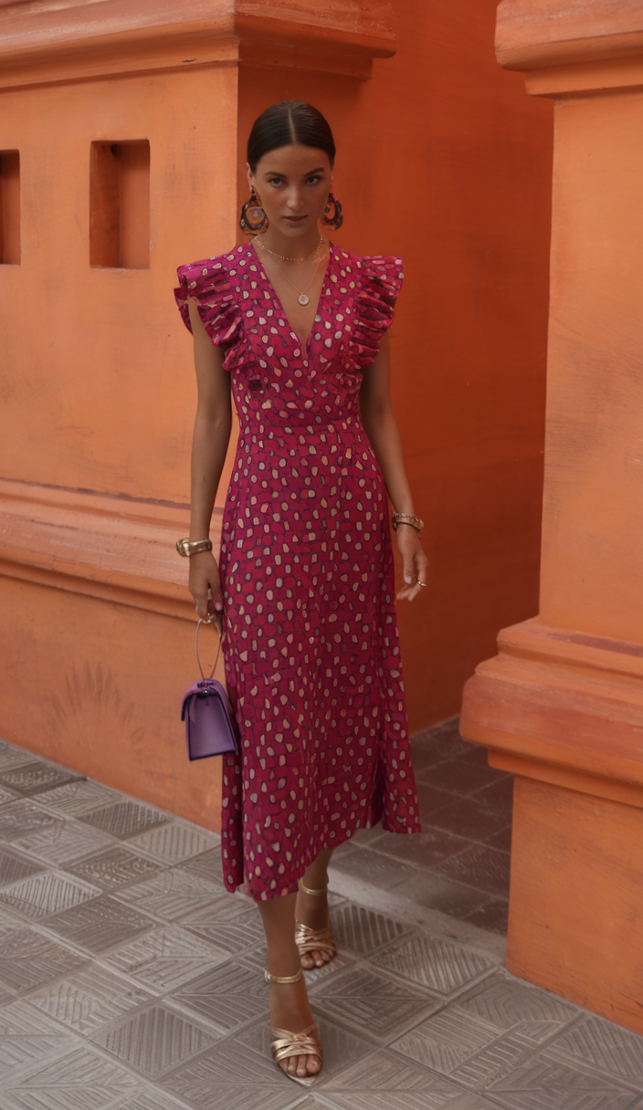 The fitted V neck midi dress with ruffled sleeves makes a statement for summer in 2025. Crafted from rich magenta fabric, its subtle polka dot design offers a playful yet moody balance while the flowing hemline enhances movement. Finished with gold strappy sandals and a structured mini bag, the blend is best characterized as casual and chic.