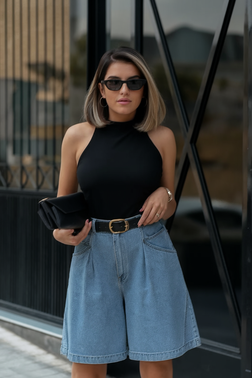 A timeless black gap sleeveless halter top matched with wide-leg vanage denim shorts form a modest yet fierce appeal. The high-waisted fit, black belt in the midsection, bolsters the structure. This outfit is wrapped up with a clutch bag together with angular glasses which gives a beautiful effortless skin. This look is an essential for summer 2025, fusing Italian elegance and casual European vibe.