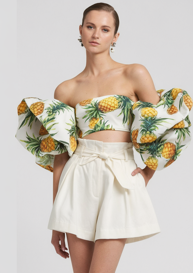 A pineapple off-shoulder crop top with dramatic puff sleeves provides a splash of youthful elegance to this chic summer look. Paired with high-waisted white shorts featuring a tie waist detail gives this outfit youthful playfulness and structure. The bold sleeves and fresh print bring summer inspo, making this a must have for stylish European getaways.