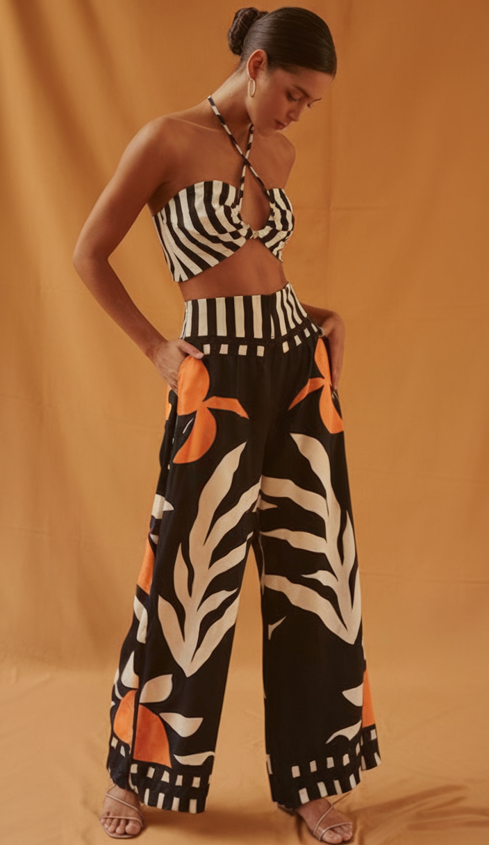 This two piece set includes a traditional black-and-white striped halter crop top that shows off the owner’s front torso while giving a contemporary regality due to its twist front. The high-waisted wide legged pants are stunning with an earthy toned bold graphic print which gives off a cool effortless posture. This ensemble is so chic it can be incorporated into the capsule wardrobe for summer of 2025. It has the artistic flair of Ibiza which is combined with an inspired artistic touch.