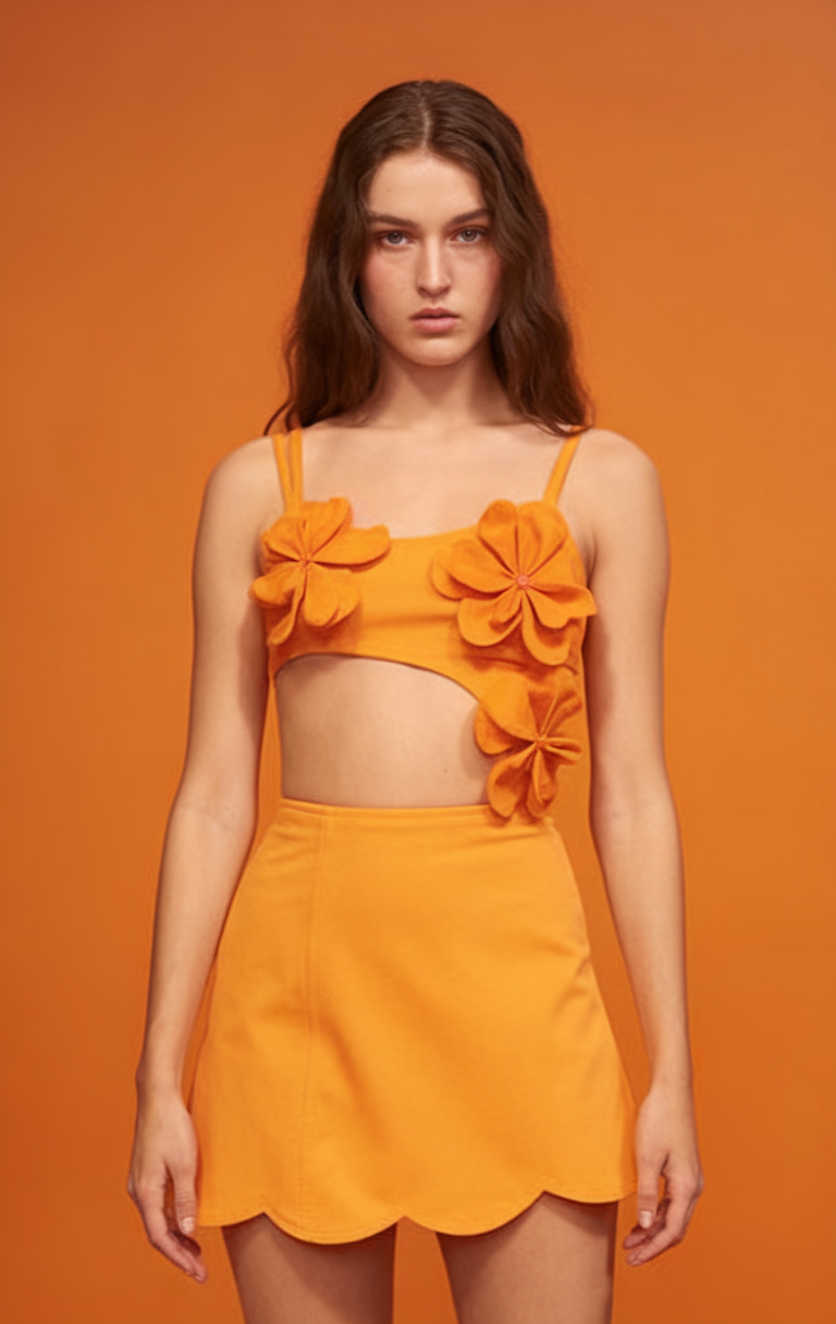 Bold, yet playful describe this vibrant orange set. The detail in the asymmetrical floral set is simply stunning. This became possible because of the high structured crop top that uses a side cutout which meets a scalloped hem mini skirt giving a contemporary twist to summer classics. This stunning and simple silhouette ensures an ideal outfit for a European holiday vacation in 2025.
