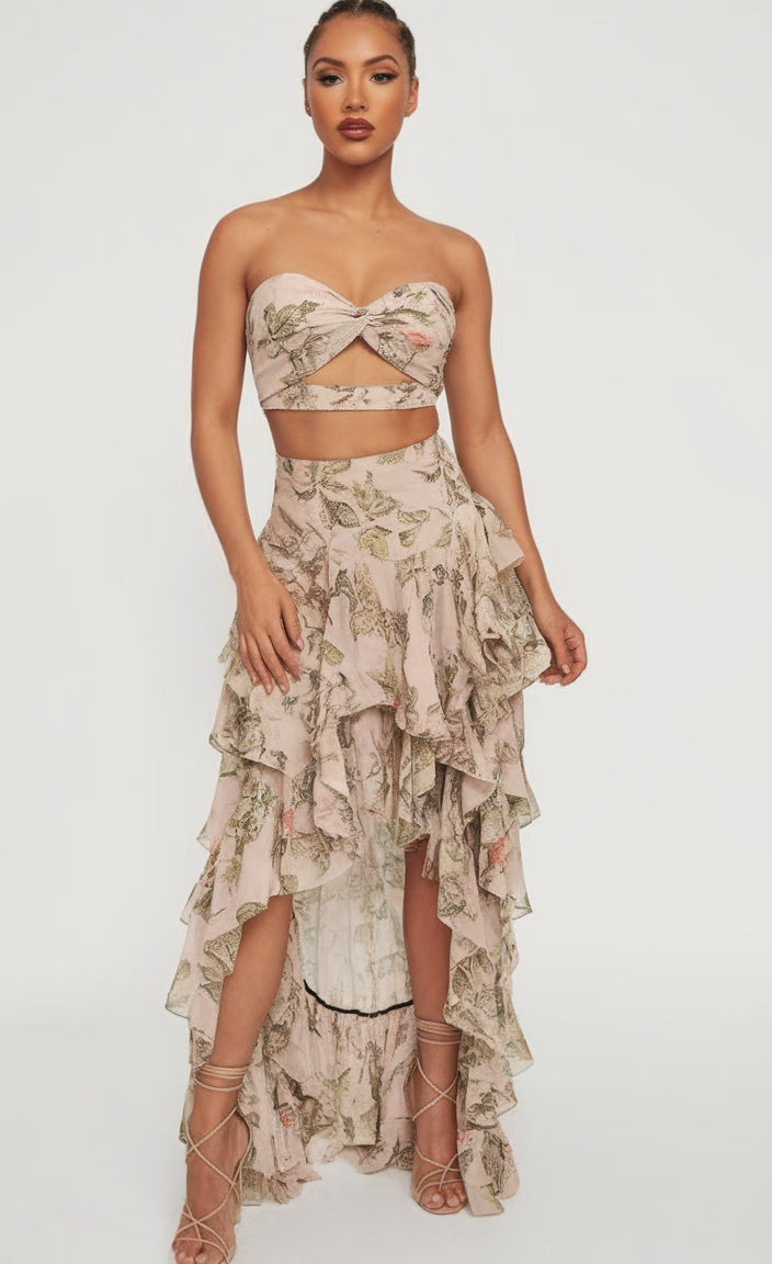 Set the tone for summer 2025 outfits with an elegant piece that is sure to make you stand out. Perfect for summer 2025, this bohemian style two-piece set with a light floral print on soft beige fabric is a dreamy addition to your wardrobe. It features a strapless twisted crop top with a dainty cutout and a high-low ruffled skirt. The flowing layers combined with an asymmetrical hemline will ensure that you look and feel marvelous.