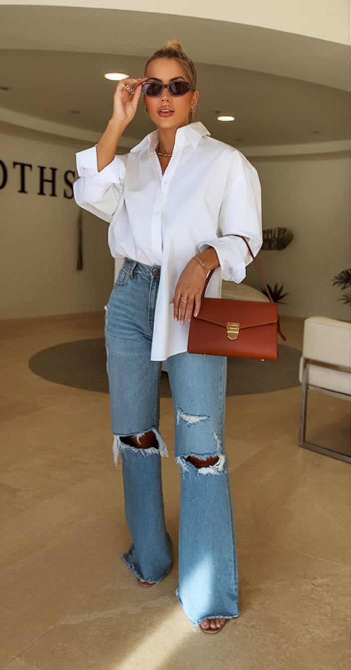 Ripped denim jeans paired with an oversized white button-up shirt create the best modern casual look. Perfect for 2025, this edgy outfit brings out a laid back vibe with a splash of sophistication when paired with a structured brown handbag and statement sunglasses. The loose silhouette of the shirt and the ripped denim jeans blend perfectly together to achieve a refined minimalist look.