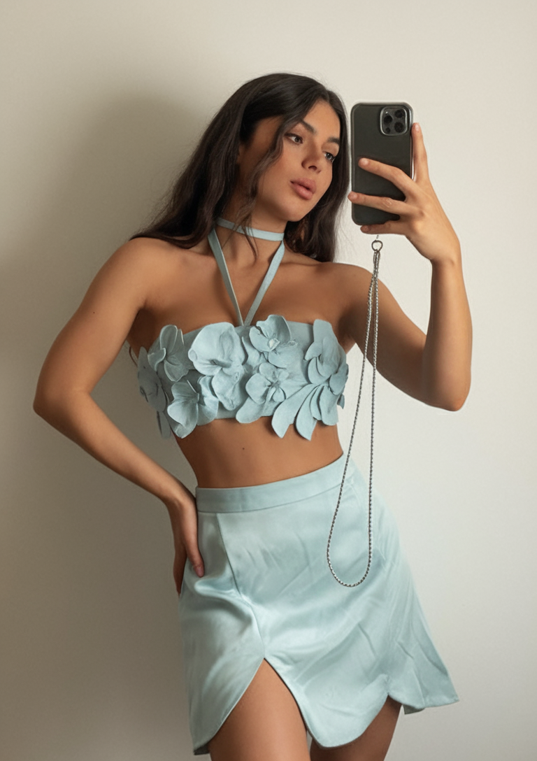 A romantic and ethereal summer look can be achieved with the soft satin two-piece set in pastel blue. The strapless crop top has floral appliqué details that add texture, very delicate and sophisticated. The subtle draped skirt is high-high waisted and mini length, while the asymmetry adds to the lightness of the skirt. It is the perfect outfit for warm weather occasions.