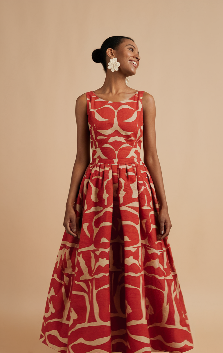 This dress has lively red floral patterns and a flowing maxi design that makes it perfect for the beach. The sleeveless, fitted bodice with black ruffles emphasizes the red dress and the voluminous skirt gives it a lot of movement. With big floral earrings, this outfit becomes wonderful for inspiration in building the perfect summer collection.
