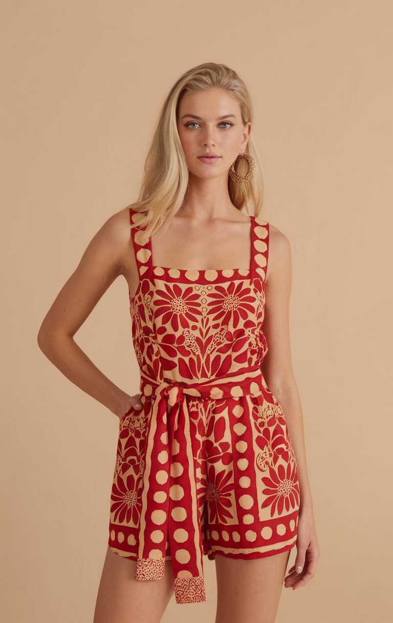 #18 Beige and Bold Red Printed Romper