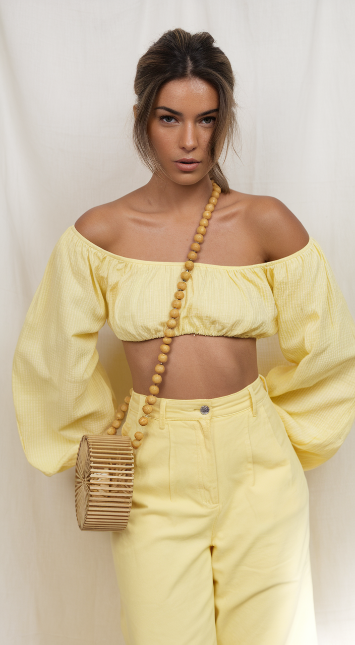 This womenswear look exudes cuteness and elegance with a fun and chic, soft pastel yellow crop off the shoulder blouse with oversized sleeves, and pastel yellow high waisted tailored pants that give both a Korean fashion and easy styling vibe. It is totally street-style fashion women appropriate. The look is completed with a wooden bag fully made out of beads, which is just eye-catching.
