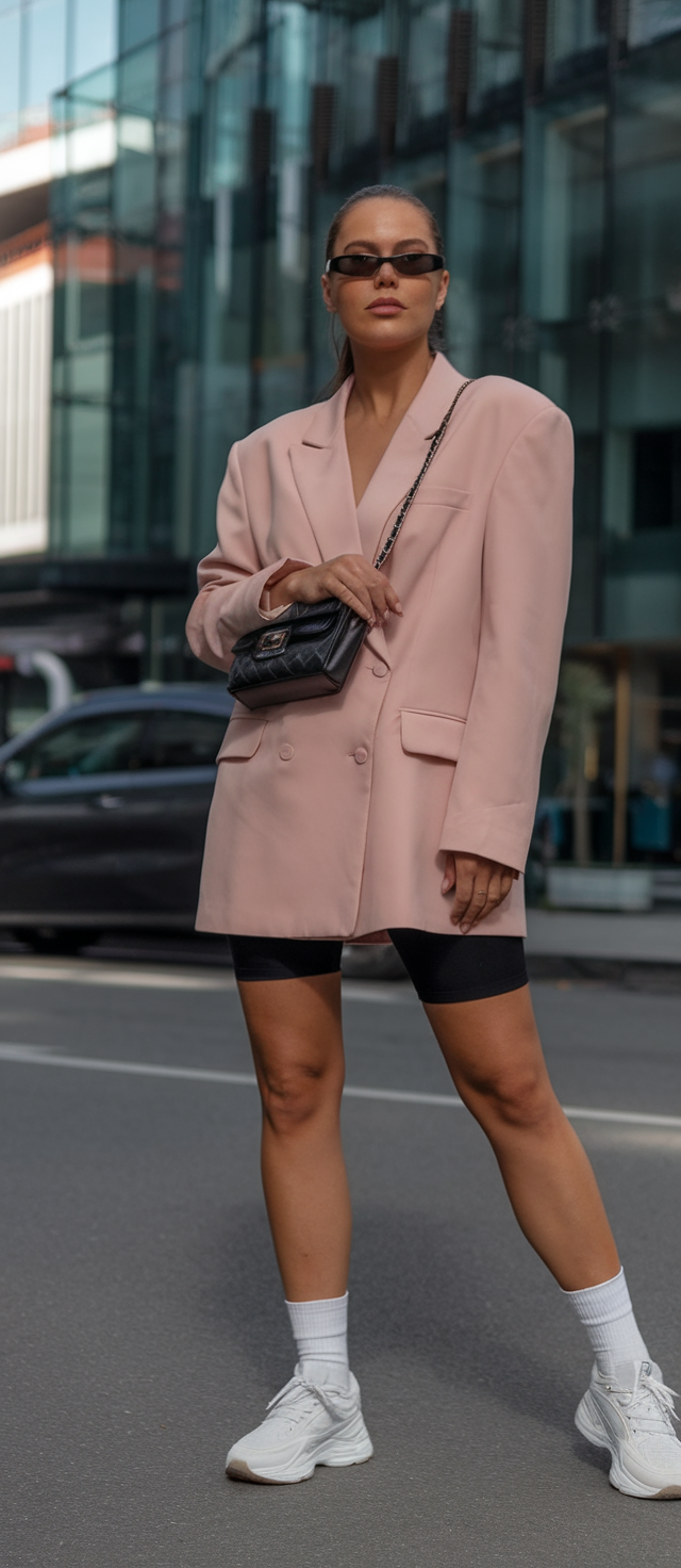 Women’s streetwear fashion is enhanced with a blush pink sporty oversized blazer that adds a striking structure in the outfit. Biker shorts add to the design contrast between sleek and casual which style wise is perfect for Summer NYC 2025. While white sneakers and ribbed socks bring in an athletic vibe, the mini black quilted bag with a chain strap is stylishly chic.