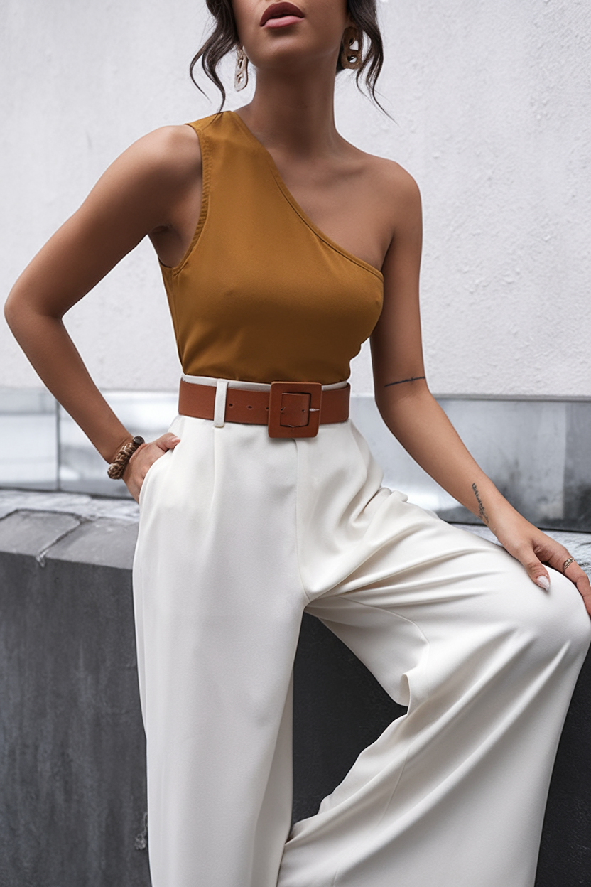 #14 One Shouldered Elegance with Flowy Wide Leg Trousers