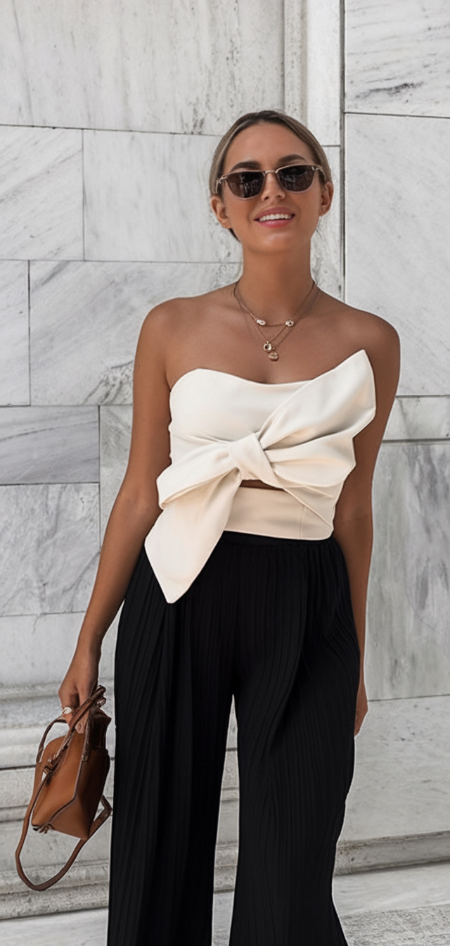 A top with a classy bow detail that is strapless serves as the focus point here. The trousers worn, which are black pleated wide leg, offer a contrasting balance that looks great in street fashion. This fashion is finished off by layering gold necklaces and a small brown handbag that brings everything together while also adding some glamour which will be on trend for womens fashion NYC 2025 summer style casual outfits.