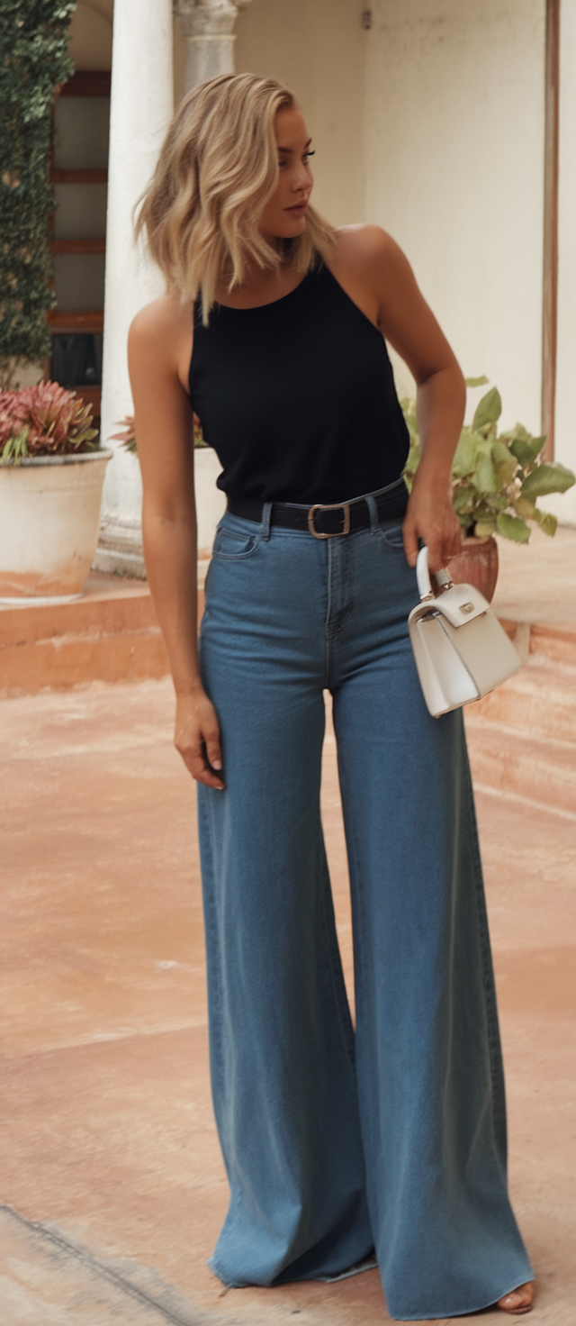 A simple classic street look, an elegant black sleeveless top and high waisted wide legged denim jeans gives a modern day silhouette. To add some definition, a black slim belt is incorporated while a structured white handbag balances the darker tones. This overall style is great for running errands across New York City or for a more casual streetwear fashion women street aesthetic.