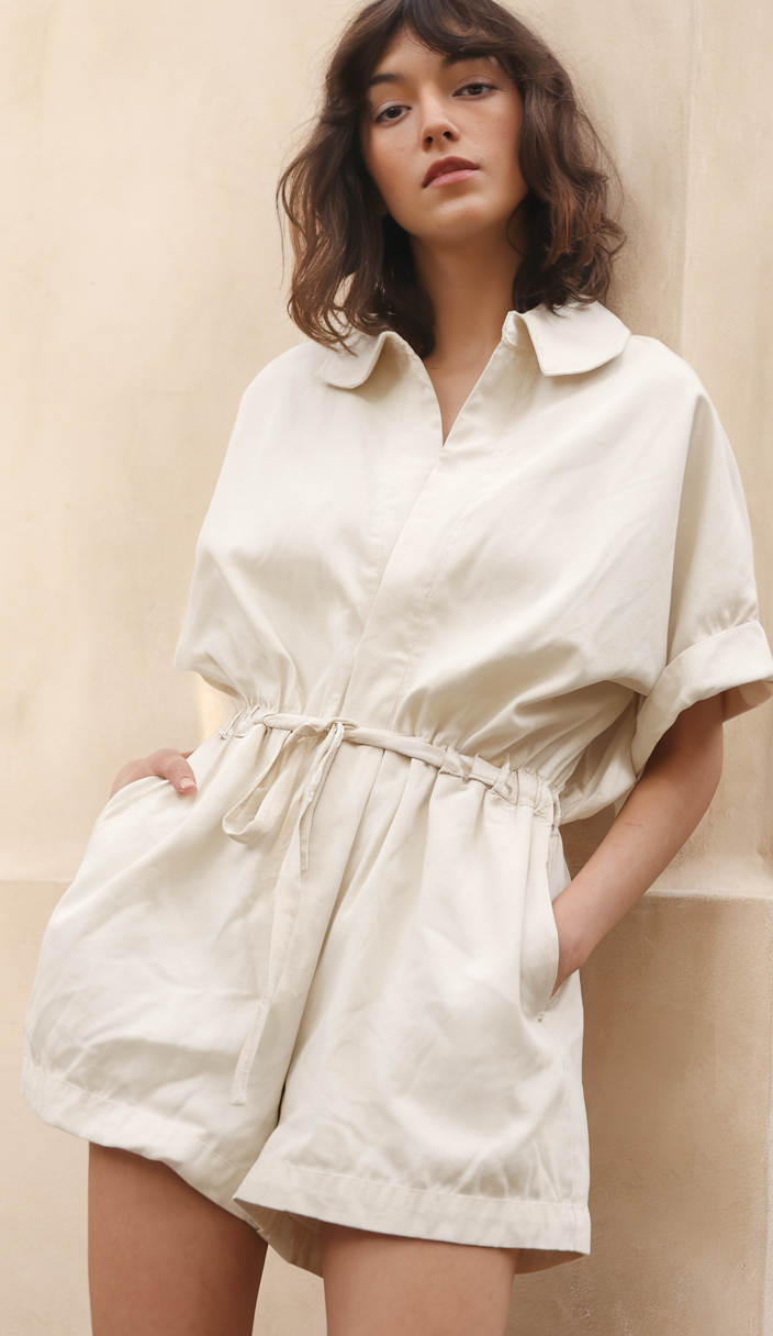 A beige light-weight utility style romper with an oversized collar and cinched waist gives an effortless polish to the overall Korean fashion inspired look. The loose shorts along with the rolled-up sleeves add to the comfort making it ideal for a tourist venturing out in London or York, The overall monochrome scheme adds to the sleek design.