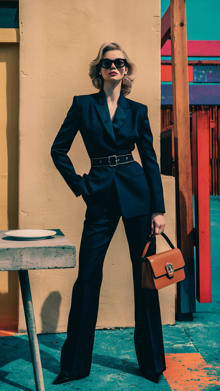 A sleek black suit with sharp tailoring is cinched at the waist with a bold belt, creating a powerful silhouette. Paired with a structured brown handbag and pointed heels, the ensemble radiates confidence and professionalism. This is a standout formal office outfit for 2025.