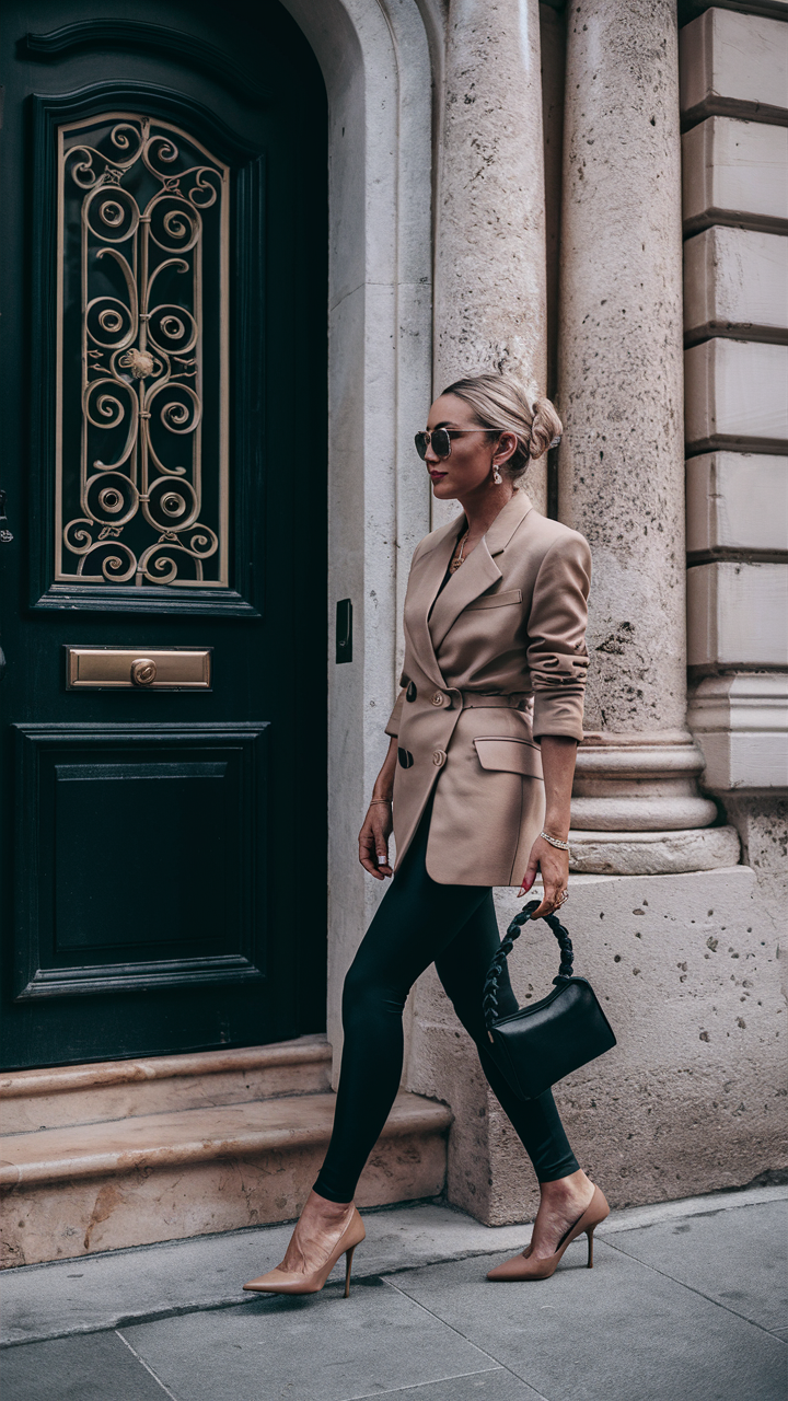 This outfit combines a fitted beige blazer with faux leather leggings for a chic and edgy look. Nude heels add elegance, while a small black handbag complements the minimal color palette. Ideal for modern office wear or smart casual events.