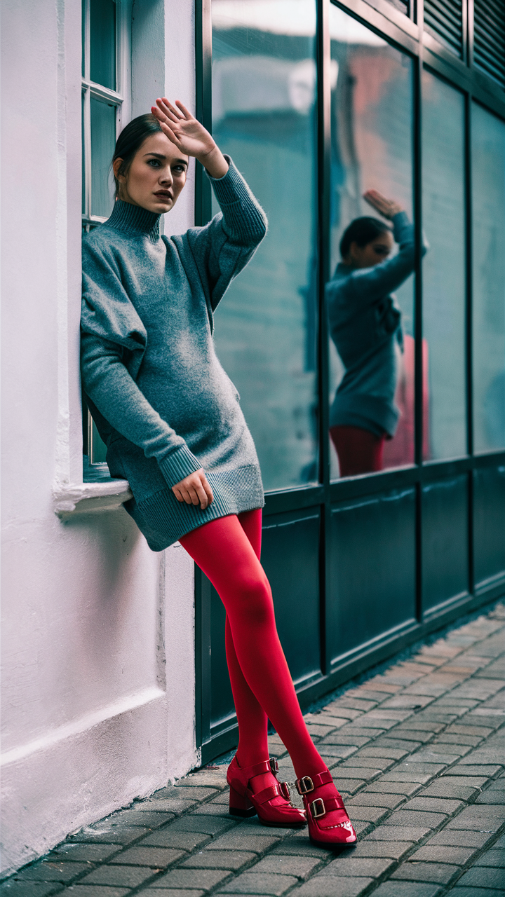 This outfit combines an oversized gray turtleneck sweater with bold red tights for a playful yet cozy look. The striking red heeled shoes with buckles add a pop of elegance to the ensemble. Ideal for a casual winter office outfit with a splash of personality.