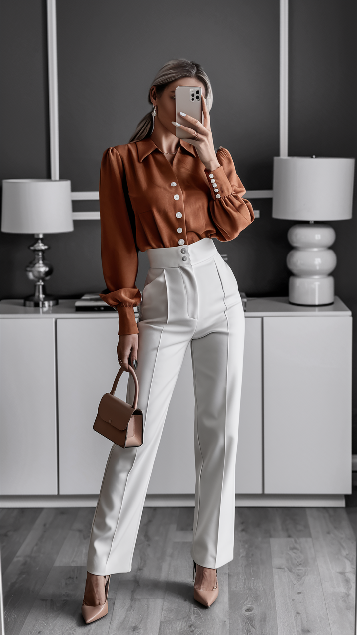 A rust-colored blouse with puffed sleeves is styled with crisp white high-waisted trousers for a simple yet chic office outfit. The clean lines and tailored fit make it perfect for Monday meetings or casual Fridays. Neutral heels and a small handbag complete the look effortlessly.