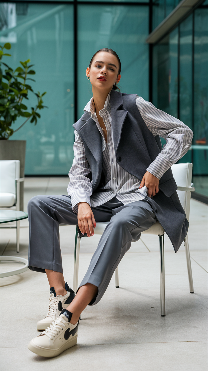 A classic striped blouse is styled with a tailored gray vest for a layered casual office look. The matching gray pants add a relaxed yet polished touch, while white sneakers offer comfort and modernity. Perfect for a casual summer office outfit or a laid-back Monday style.