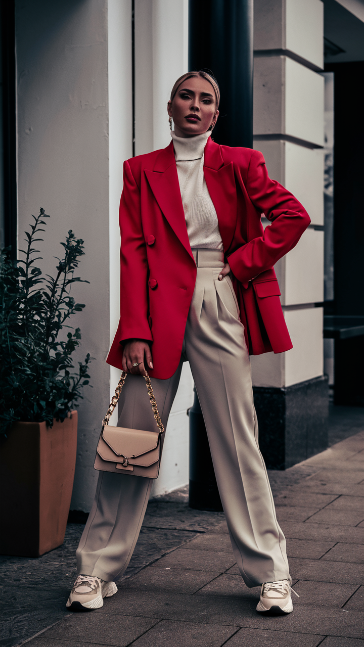 A striking red blazer serves as the centerpiece, paired with high-waisted beige trousers for a chic contrast. A white turtleneck adds a formal touch, while chunky sneakers complete the outfit with a casual vibe. This versatile look transitions effortlessly between formal and casual office outfits in 2025.