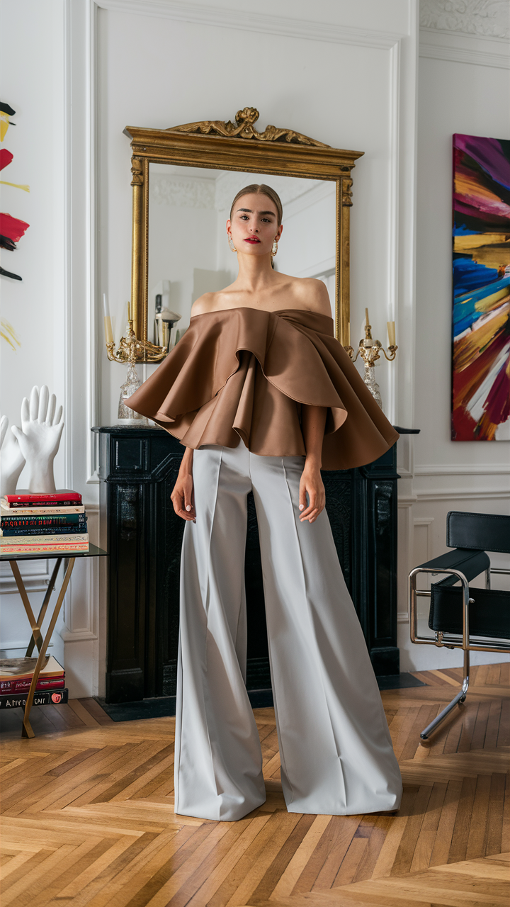 A dramatic off-shoulder brown top featuring voluminous ruffles pairs beautifully with gray wide-leg trousers. The relaxed fit of the pants contrasts the bold top, creating a simple yet striking look. Ideal for a creative office environment or casual autumn settings.