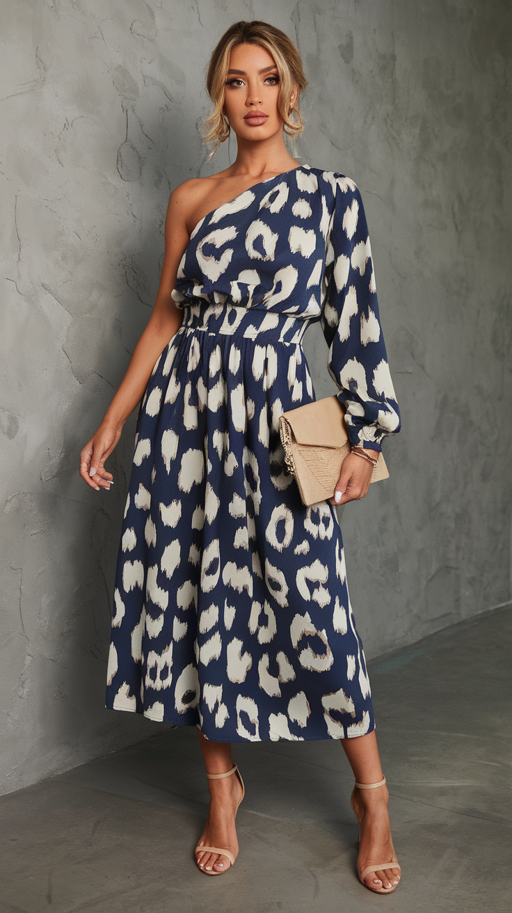 This navy and cream one-shoulder midi dress features a bold abstract pattern, perfect for a birthday shoot or autumn outings. The cinched waist and flowing silhouette make it a flattering choice for 30-year-old women.