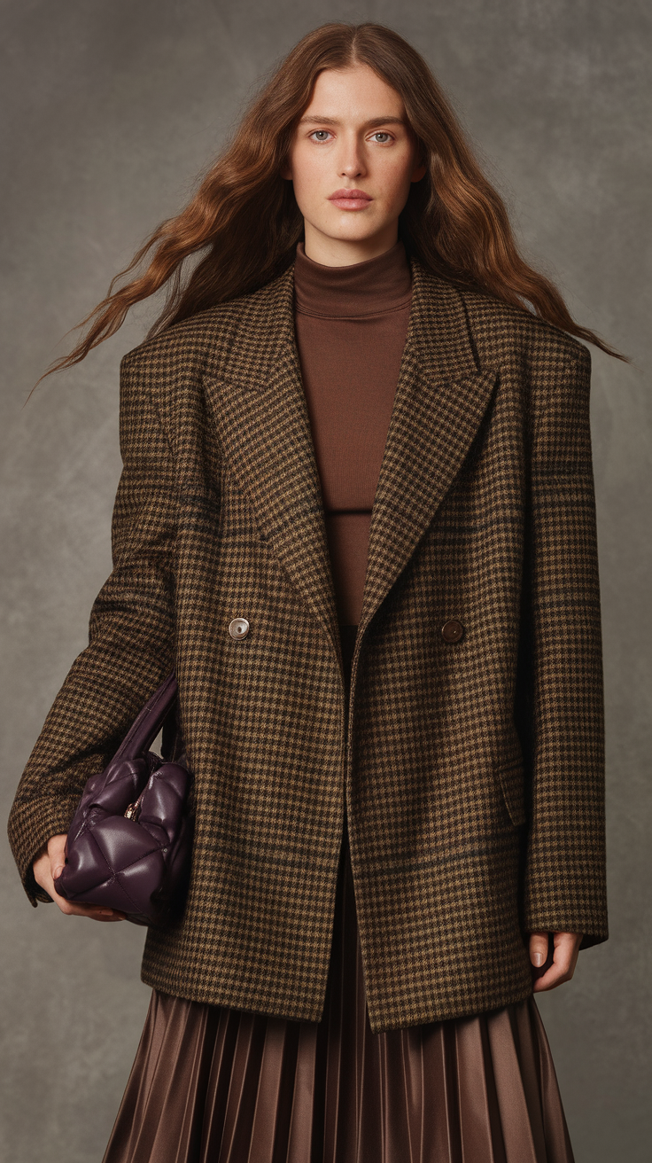An oversized brown houndstooth blazer adds a tailored touch to this look, paired with a chocolate pleated midi skirt. Perfect for autumn or hill station trips, this layered style blends classic patterns with modern elegance.