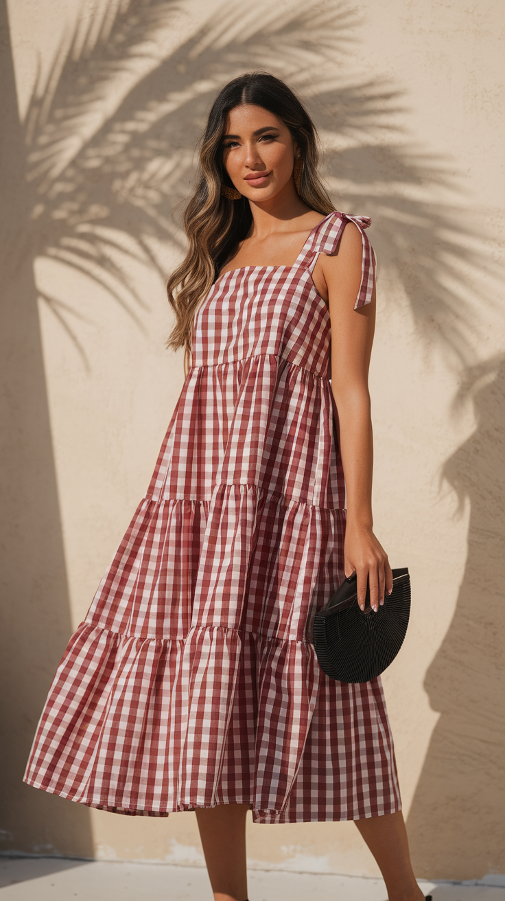 This breezy red gingham midi dress features tiered layers and bow-tied shoulder straps, perfect for a relaxed summer outing or Bali vacation. Its flowy silhouette adds charm and comfort for a laid-back look.