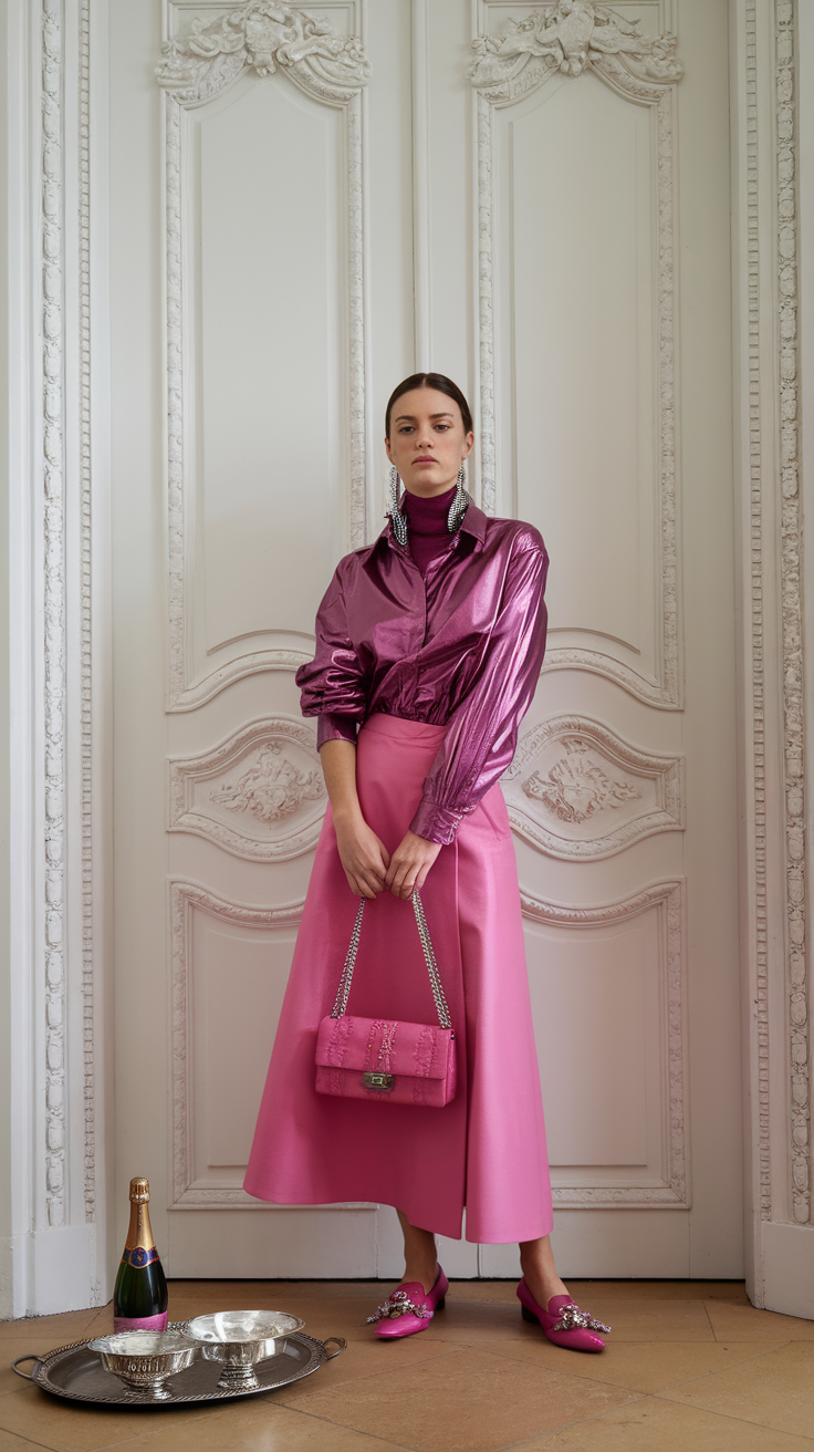 This outfit features a shimmering fuchsia metallic blouse paired with a matching high-waisted A-line skirt. Ideal for birthday celebrations or formal winter fashion, this bold look is completed with jeweled flats and a quilted purse.