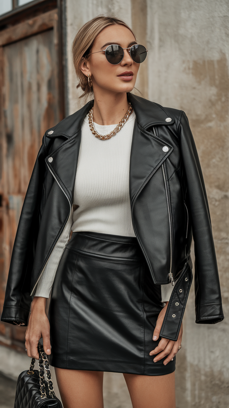 A sleek black leather jacket and matching mini skirt paired with a white ribbed top create a bold yet elegant look. This outfit is ideal for winter fashion or Diwali celebrations, offering a refined street-style vibe.