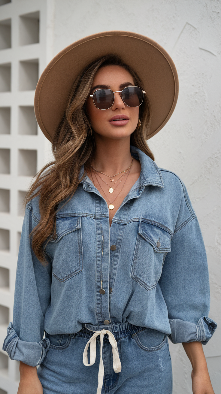 This casual ensemble includes a light-wash denim shirt paired with matching drawstring-waist denim trousers. A wide-brimmed beige hat and layered gold necklaces elevate this look, perfect for hill station trips or arcade outings.