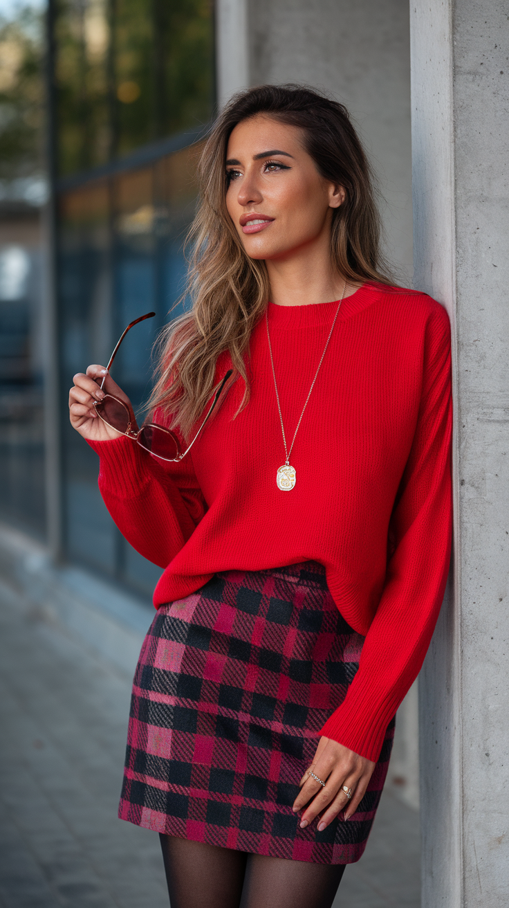 A vibrant red knit sweater is paired with a high-waisted red and black plaid mini skirt, creating a classic winter fashion look. Ideal for street styles or casual Diwali outings, the combination is both bold and cozy.