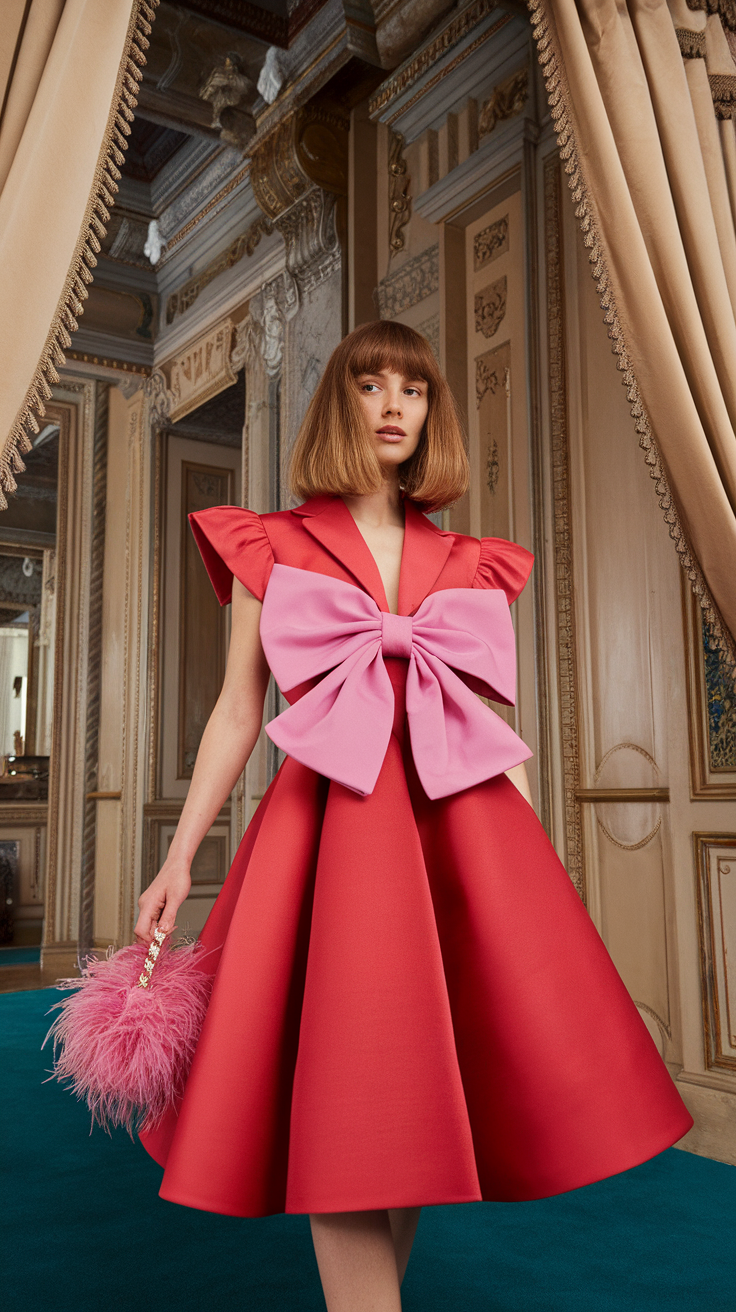 This structured red dress features a dramatic pink bow at the waist, complemented by statement shoulders. Perfect for a Christmas gala or birthday shoot, its voluminous skirt creates a sophisticated yet playful look.