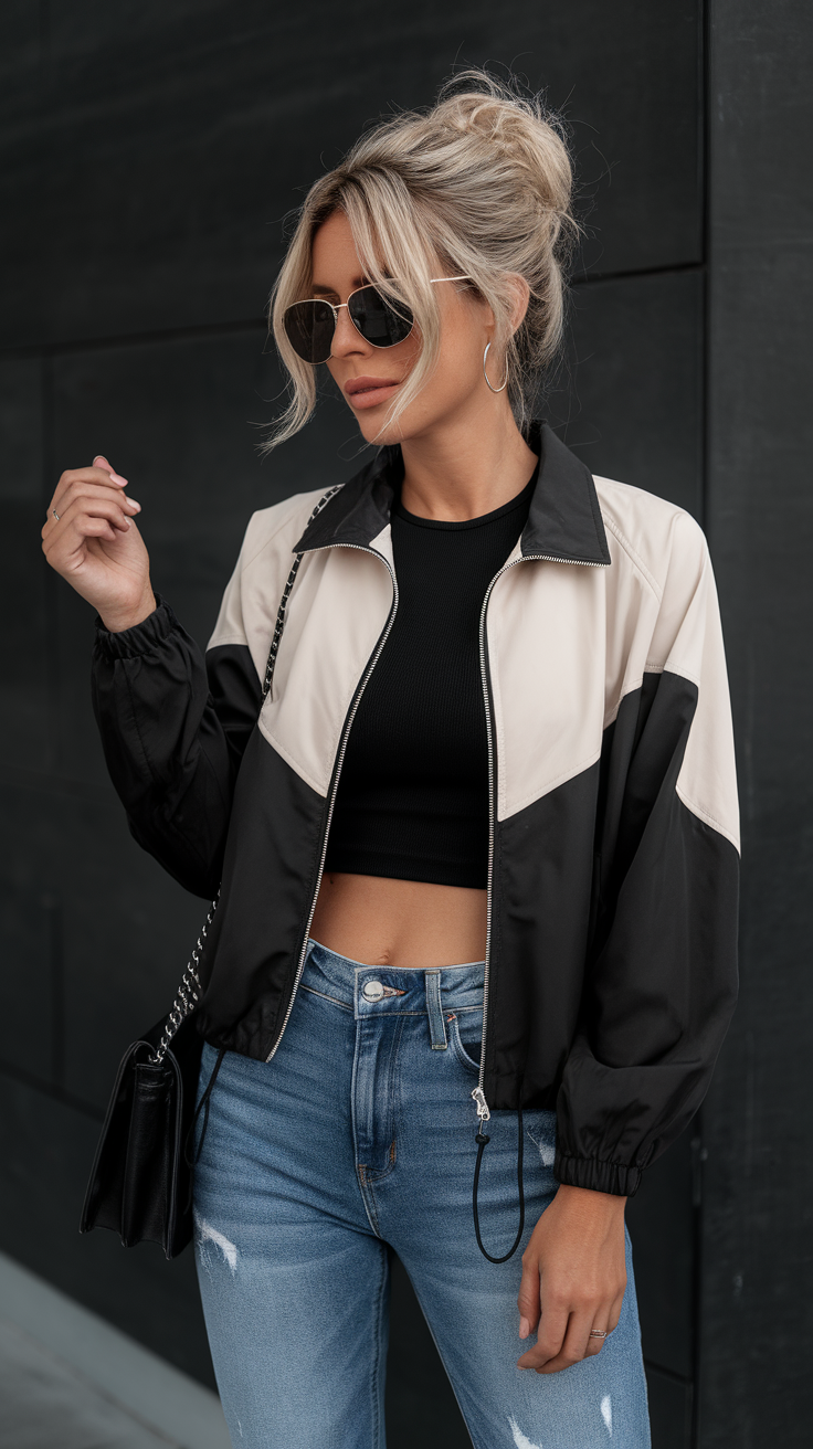 This relaxed outfit features a baggy two-tone jacket layered over a black crop shirt with ripped jeans. It’s a perfect hill station look, combining comfort and street styles for midsize women.