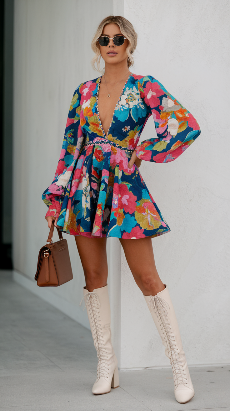 This vibrant floral mini dress with puffed sleeves and a deep neckline is paired with knee-high lace-up boots. The bold print and flared skirt make it an ideal choice for birthday shoots or hill station vacations.