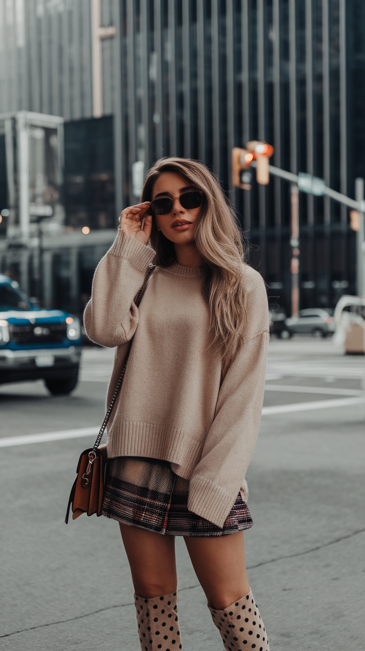 A cozy beige oversized sweater is paired with a classic plaid mini skirt for a warm, trendy autumn look. Styled with polka-dot knee-high boots, this outfit blends comfort and street styles seamlessly.