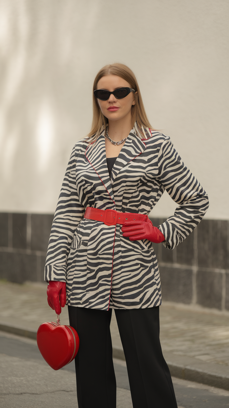 A striking zebra-print blazer is paired with red accents, including a bold belt and gloves, for a chic, modern look. The heart-shaped red clutch adds playful sophistication, making it perfect for festive occasions or a Coldplay concert.