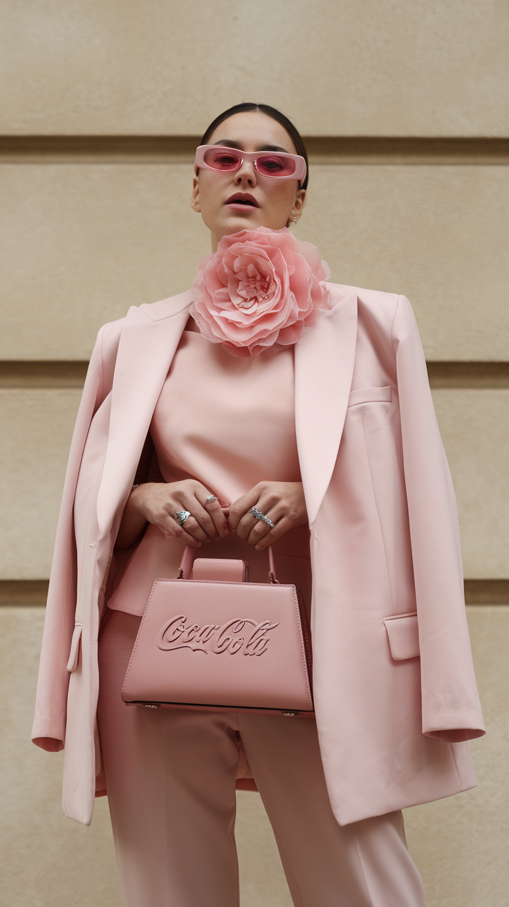 A tailored pink suit is elevated by a large fabric floral detail on the top and paired with a structured pink handbag. Styled with pink sunglasses, this monochromatic look is ideal for spring trends or a Dua Lipa concert.