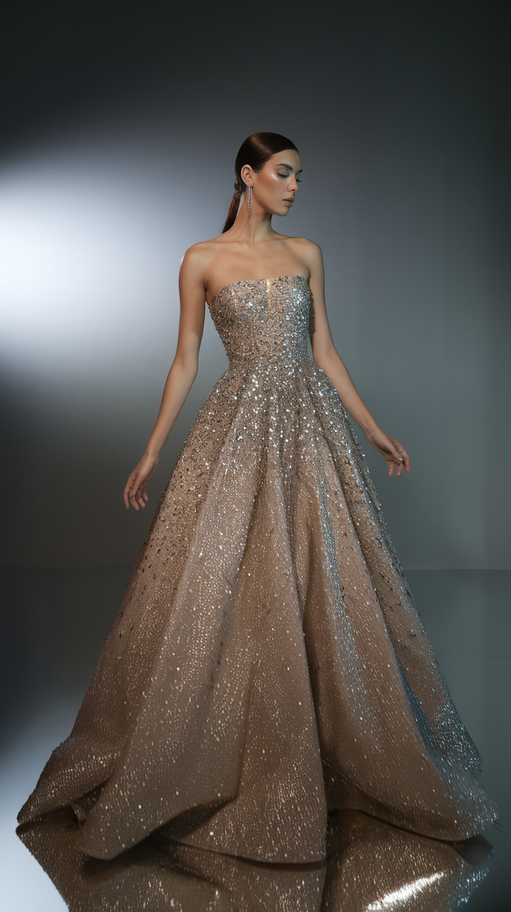 This strapless ball gown sparkles with intricate silver embellishments, creating a stunning, ethereal silhouette. Perfect for a graduation celebration or a dazzling year eve gala.