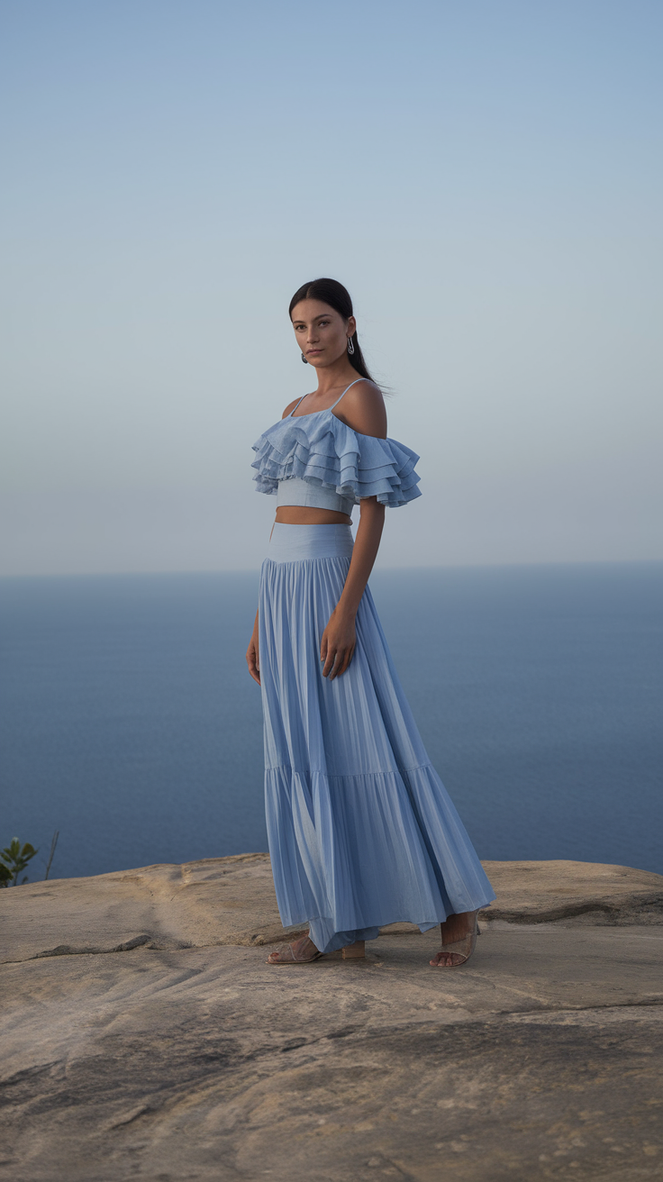 This breezy outfit features an off-shoulder cropped top with layered ruffles, paired with a flowing tiered maxi skirt in a soft light blue. Perfect for summer trends or a casual Coachella moment.